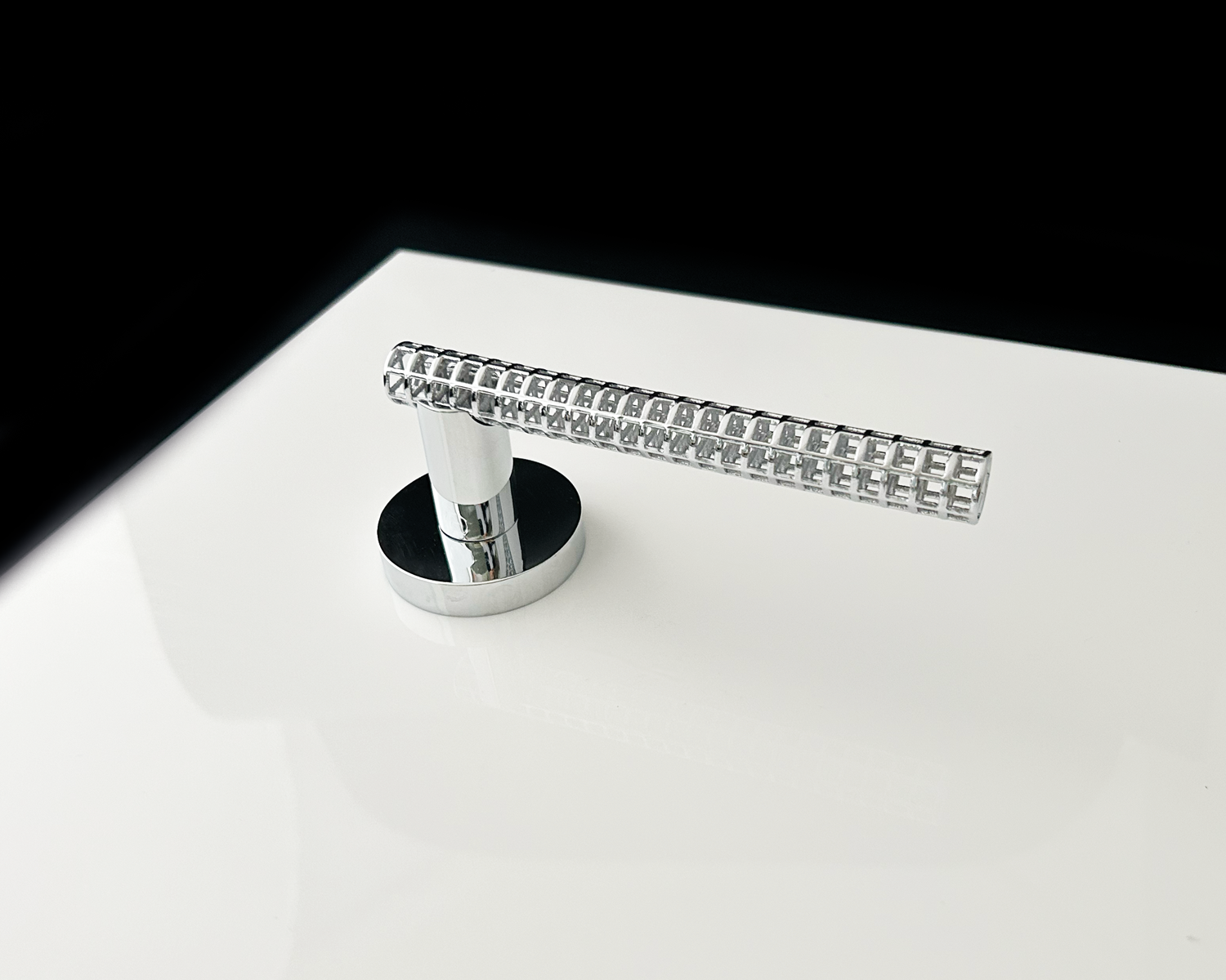 The handles in the Reticube Technology collection are sold in pairs. The escutcheon at the base of the handle and the one that houses the keyhole are both made of solid chrome-plated brass while the texture is of the handle is also chrome-plated brass but light in its cage-like composition.