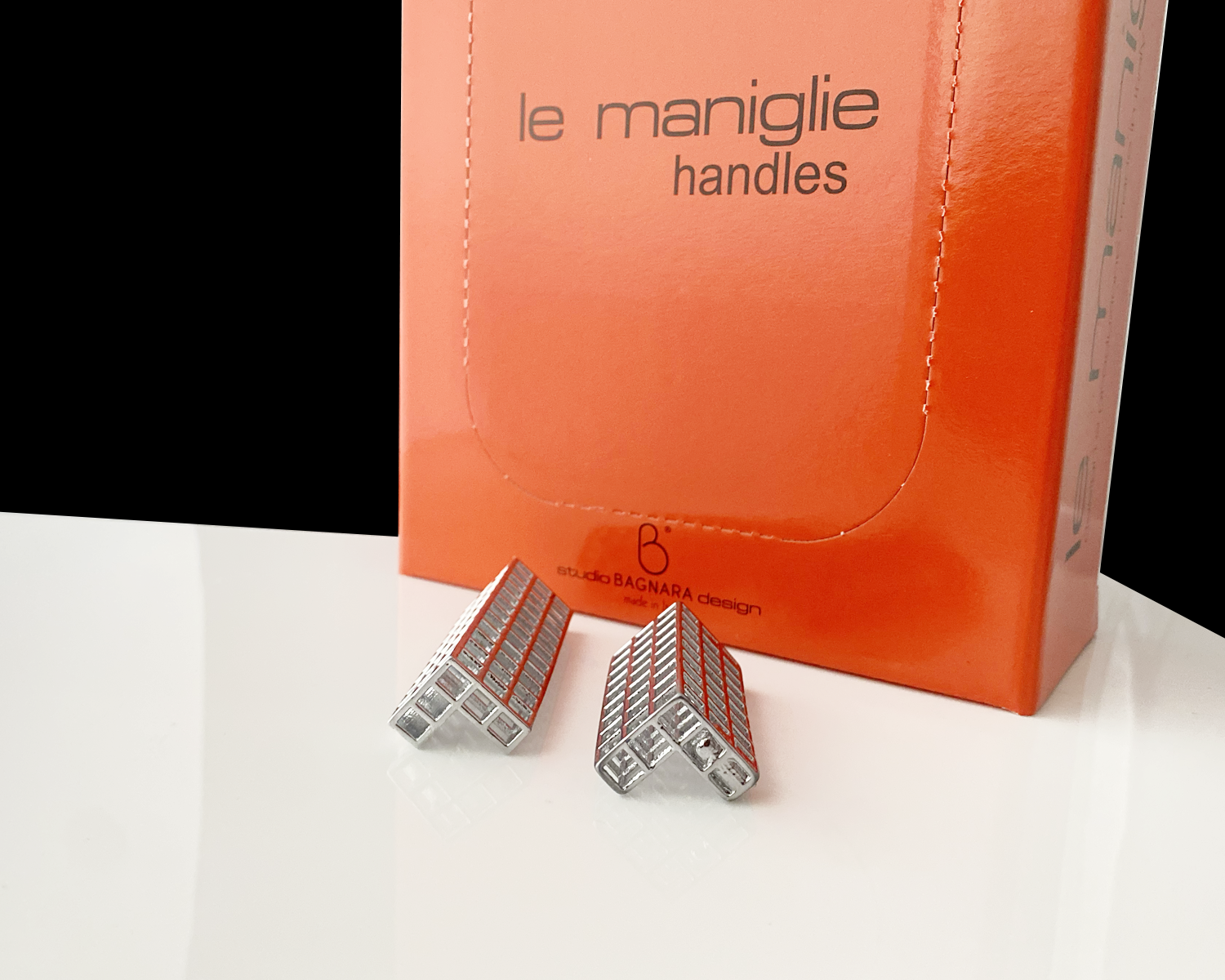 All the furniture handles of the Reticube Line are sold in their rigid orange packaging and equipped with mounting screws.