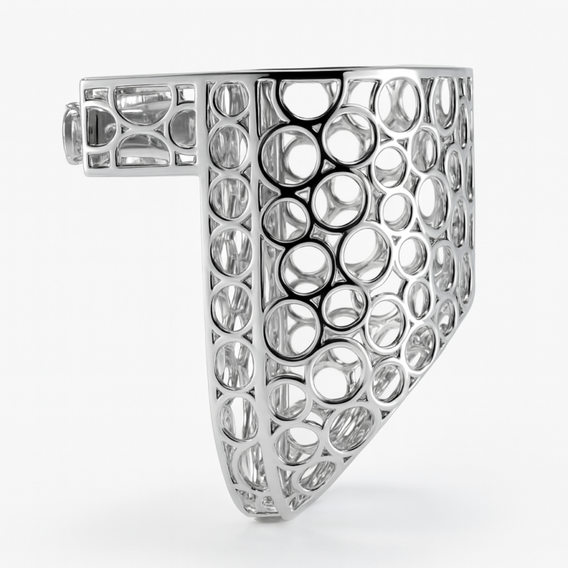L’unicità è sicuramente trasmessa dalla presenza di cristalli Swarovski e dalla forma particolare della gabbia di cui è composta la maniglia. Un reticolo squadrato di pieni e vuoti dalla trama irregolare che genere una maniglia sinuosa e armonica che ci permette di guardarci attraverso.