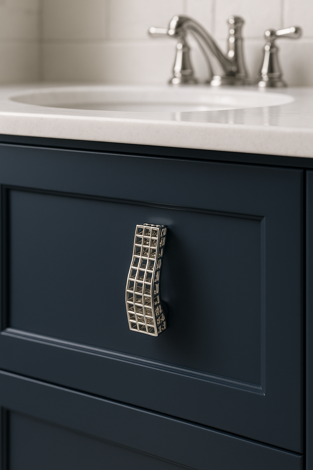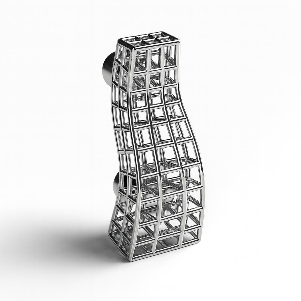 La maniglia per mobile 3D Margot affascina per le sue linee sinuose e armoniose, ispirate al movimento dolce e fluido delle onde. La sua struttura leggera e raffinata, composta da una trama a gabbia di piccoli rettangoli, crea un gioco di pieni e vuoti che dona profondità e luminosità al mobile su cui è applicata.
