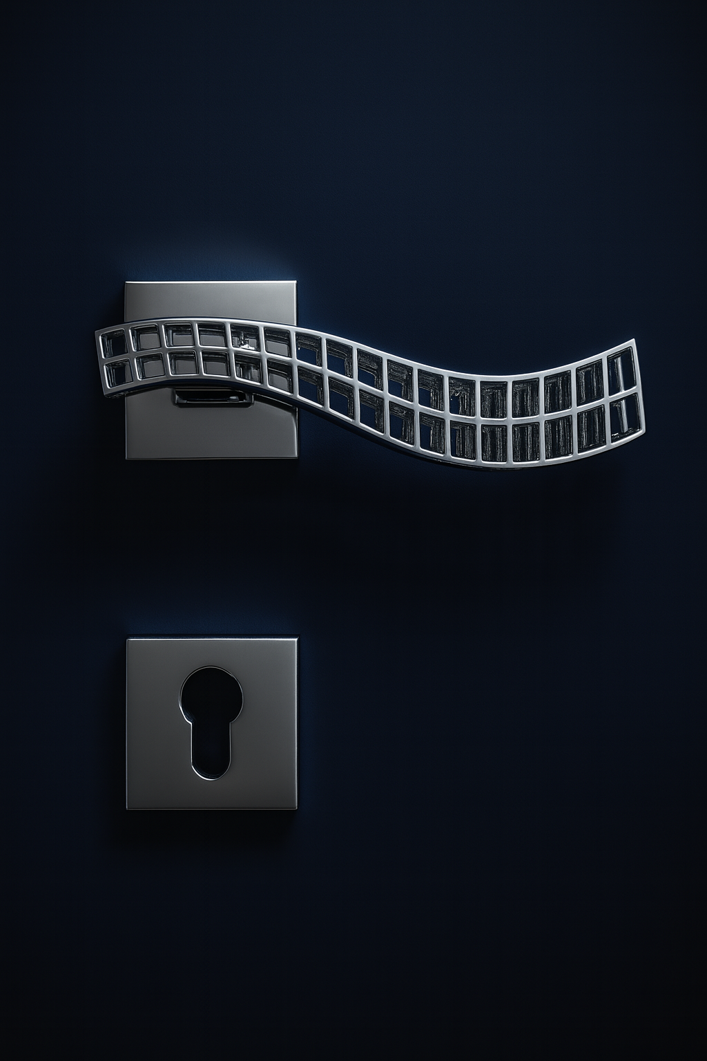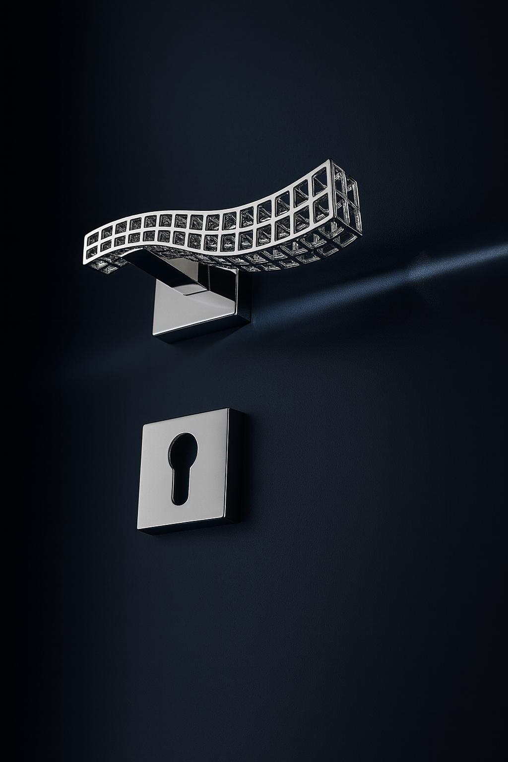 La sua impugnatura, sinuosa e fluida, unisce dinamismo e funzionalità, offrendo una presa confortevole e una forma dal fascino contemporaneo. La sequenza di pieni e vuoti crea un raffinato gioco di luce che valorizza la superficie della porta e ne amplifica la luminosità.